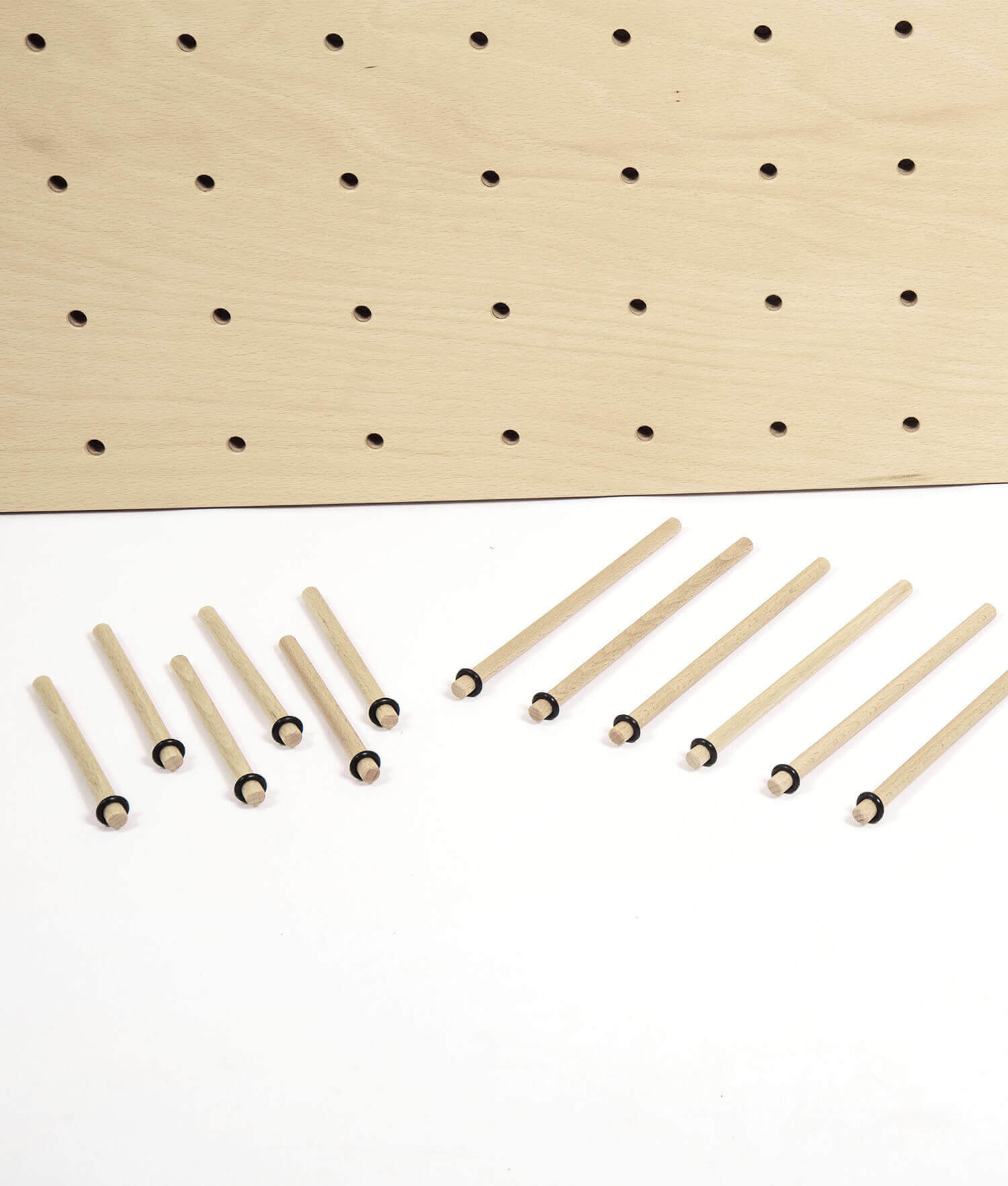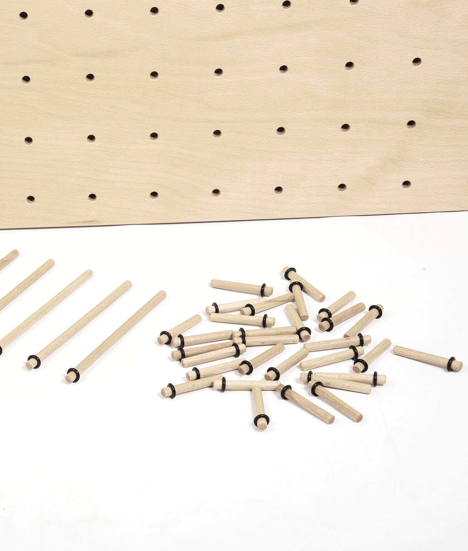 42 Holzstifte in drei verschiedenen Längen mit Gummiringen